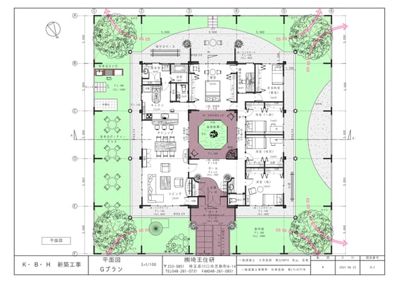 住まいの中央に1cube一辺5mの真四角の外(庭)を切り取った。